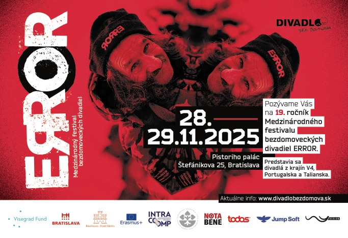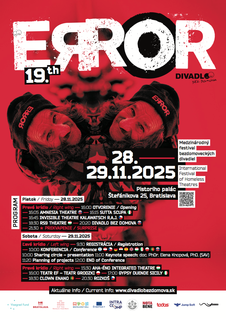 The ERROR Conference is a vital part of the project, offering a unique platform for leaders of theatre groups, NGOs, individual artists, and cultural activists to connect, share, and collaborate. As a half-day event, it provides a focused and intensive space to present work, exchange methodologies, and plan future cooperation. For many working with homeless and vulnerable people, this conference is the only opportunity in the year to engage internationally and in such depth. This year, the conference will feature a new element: a keynote lecture by an academic researcher from the Art Research Centre of the Slovak Academy of Sciences (SAV), an expert in theatre and its societal impact.